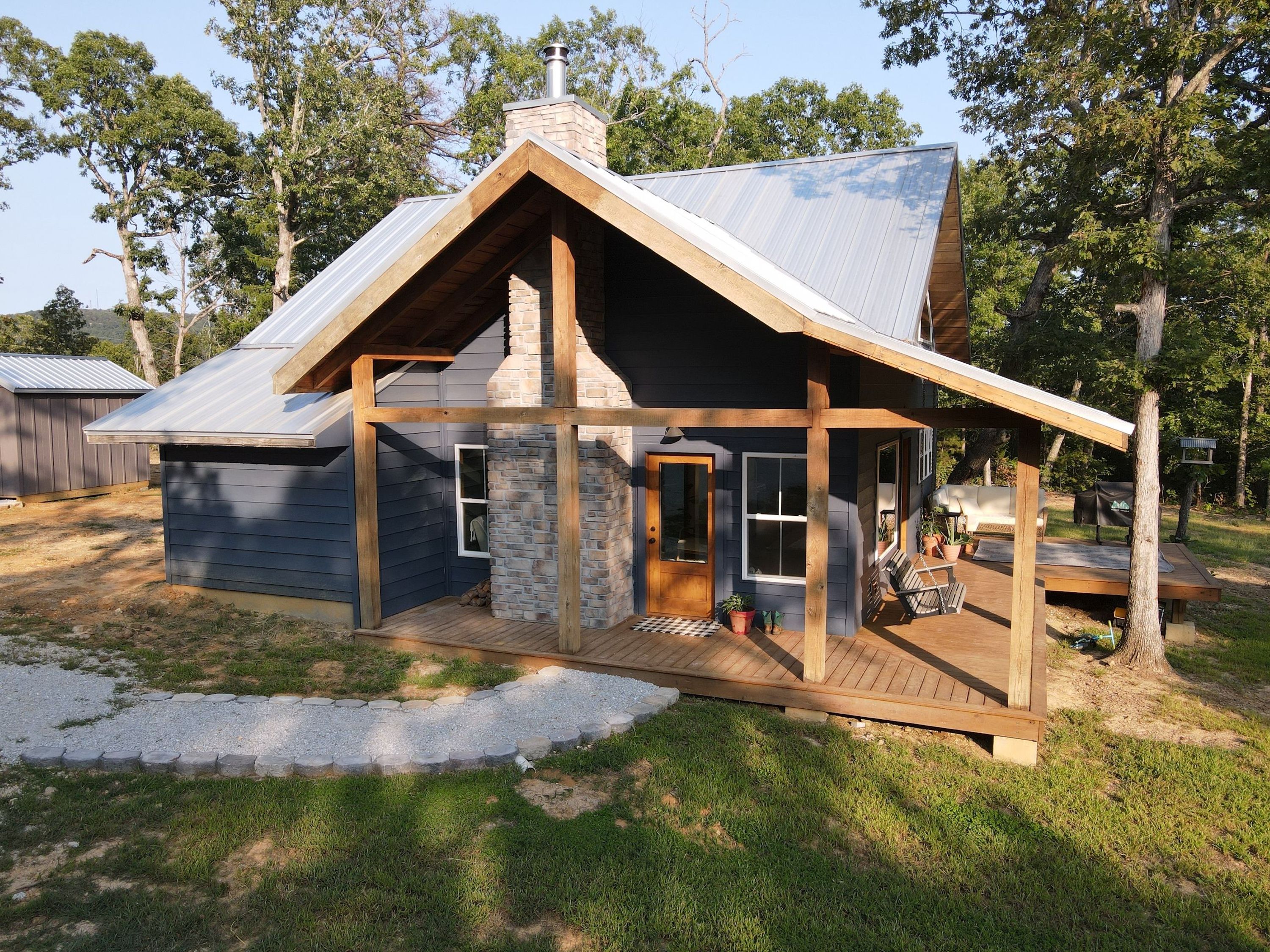 That stunning custom home in the heart of the mountains awaits you. This gem is loaded with character and modern farmhouse charm. Setting in the middle of stunning Ozark Mountain hardwood timber, this home is packed with all the heart and soul that truly makes something special. Located just off the gravel county road, this quaint oasis is at the end of a newly graveled chat drive that meanders amongst the lush white oak and red oak timbers that grace the landscape. Rockwell couldn’t capture the essence of this beautiful place on his best day. The drive ends at the home, complete with rock pavers and a recently built custom massive rock retaining wall. The rolling landscape lends itself to the amazing view that can be seen from the oversized deck, and this mountain view is sure to impress. The land is loaded with hardwoods and wildlife and would be ideal for a hunting getaway or just a pleasure to walk off your front porch and head to your stand to chase the plentiful wildlife that call this tract home. There are opportunities for deer, bear, turkey, and more! The home is entirely wrapped in metal siding and metal roof for years of maintenance and hassle-free enjoyment. The large, covered deck accents the east and south of the house, and a larger setting area compliments the BBQ area for all your entertaining needs. On the porch, you are greeted with Alder wood custom doors, beautiful rustic fixtures, and a towering custom rock fireplace. The great room is topped off with vaulted ceilings, shiplap wall accents, massive picture windows, alder wood trim, and a beautiful wood-burning stove. The dining/living combo flows wonderfully into the roomy kitchen with knotty alder cabinets, beautiful color schemes, custom alder vent hood, large subway tile backsplash, shiplap ceilings, and more. Transitioning into the master bedroom, you’ll find gorgeous, exposed beams, more custom trim work, shiplap accents, and plenty of storage with oversized closets and custom barn doors. The large bathroom on the main level has a tub shower, custom vanity, and dual sinks. The mudroom and laundry room are conveniently located off the back door with the ease of access and boast plenty of cabinetry and a large sink. As you head up the custom staircase, the spacious landing is brilliantly doubling as a small office. Two additional bedrooms and another bathroom top off the ensemble. The tranquil and inviting color scheme and breathtaking vista views will make you never want to leave. As the sun sets and the colors blanket the rolling hills with the cricket chirping and the birds singing, you could be sitting on the deck of your new charming home amongst your private acreage of Ozark heaven, relaxing and enjoying your life like you never thought possible. This beautiful place will bring rest and peace to your soul. Call today for your private showing.