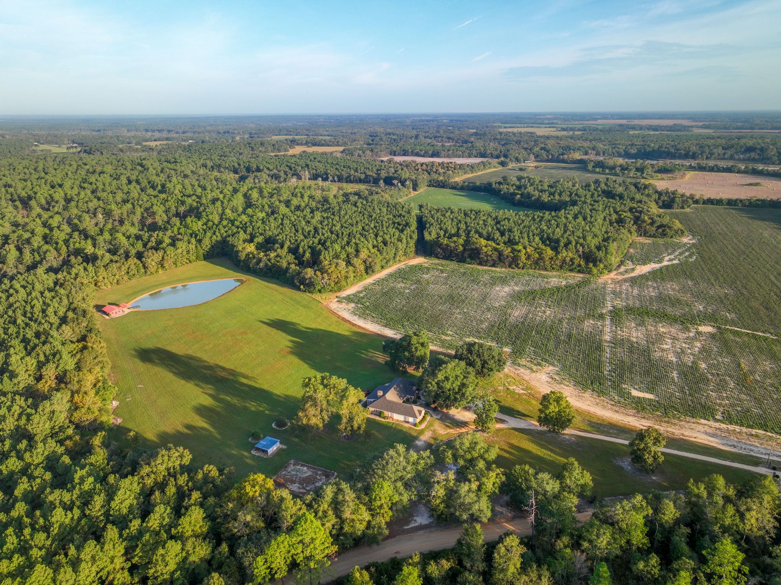 This beautiful property has the layout and amenities to become your weekend hunting retreat for the whole family. The stunning 4Br/3Ba home features a large kitchen, living space, and a spacious sunroom that overlooks the pasture and pond. The 864 sqft. pond house is best for entertaining and hosting with a kitchen area and an outdoor concrete pad for cooking or dining. The pond measures 0.70+/- acres and was previously stocked with largemouth, channel catfish, bluegill bream, and redear sunfish. The land consists of mature pine timber and two fields or food plots measuring 9.5+/- and 10.3+/- acres. Power lines cross both food plots, making them ideal dove fields. This amazing property could be your perfect retreat for you to take friends and family to, with ample space for entertainment and outdoor enjoyment.