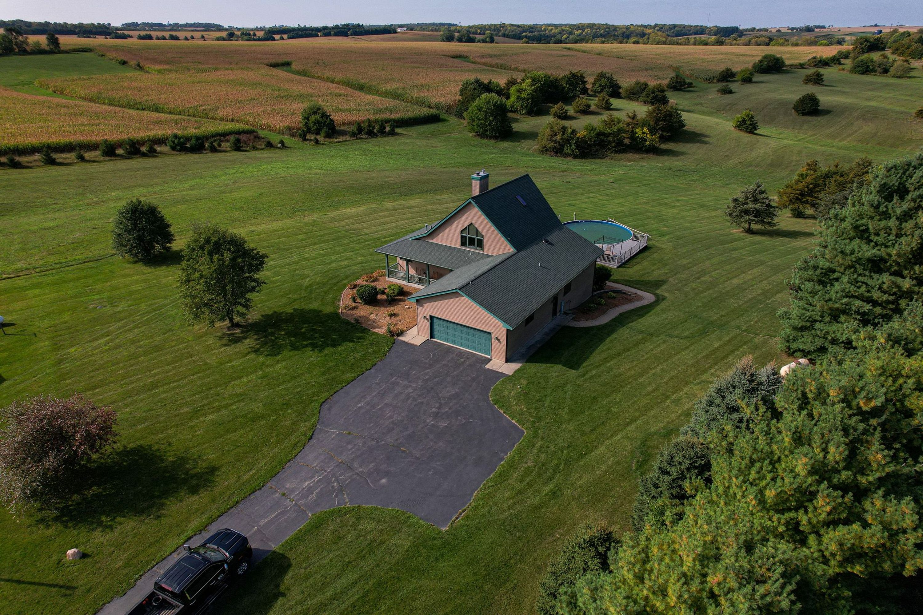 Sitting amongst the rolling hills, this property has so much to offer. The main house has 4 bedrooms and 3 bathrooms. As you walk into the home, you are greeted by a nice open flow from the kitchen into the family room with hardwood floors, a stone fireplace and beautiful windows providing tons of natural light. Two sliding doors take you out onto the deck. Off one wing of the home is a large primary bedroom, and primary bathroom with a walk-in closet. The other wing provides two good-sized bedrooms, a full bathroom to share and 36" doorways. Upstairs you have an oversized loft. The lower level provides a ton of entertaining space with in-floor heat, a fireplace, a sitting area, a pool table, and a large bar area with a beer tapper, a refrigerator and a TV. Of course, everything is enhanced because of the windows and walkout, allowing tons of natural light! Additional features include an above-ground pool with a deck, a deck off the rear of the home and a patio outside the walkout lower level. A 40x90 outbuilding, which also has in-floor heat, provides storage for all your equipment, UTVs, tractors, etc. Within the building, there is a 1 bedroom, 1 bathroom studio apartment with its own family room, bathroom and laundry. From the home and the outbuilding, you have beautiful views of the hills and scenery. The property transitions into early successional forest, then into timber and woods. Tons of nooks and pockets would accommodate food plots. On the west side of the property is 5.5 acres of tillable ground that can be rented out for income. A large blind is situated on the edge of the timber and tillable. On the other side is another area of timber. Small off-grid cabin in the woods. This property has so much potential as it would make a great hunting property, equine property or a nice getaway property.