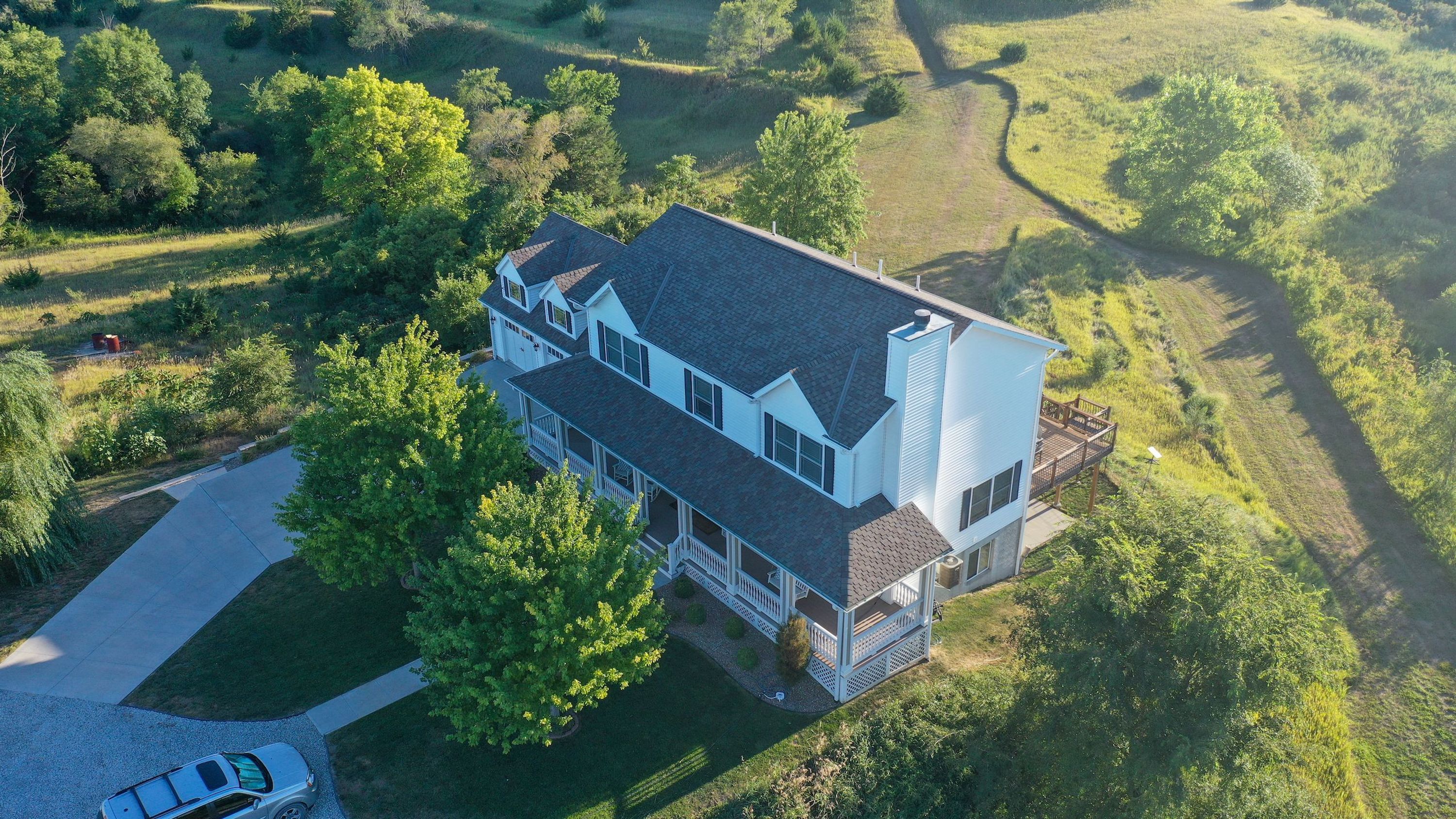 Have a cup of coffee under the wrap-around front porch to watch the sunrise or enjoy a breathtaking sunset off the back deck with exceptional views of the stocked pond and the timber-covered hills surrounding this property. This is country living at its finest.