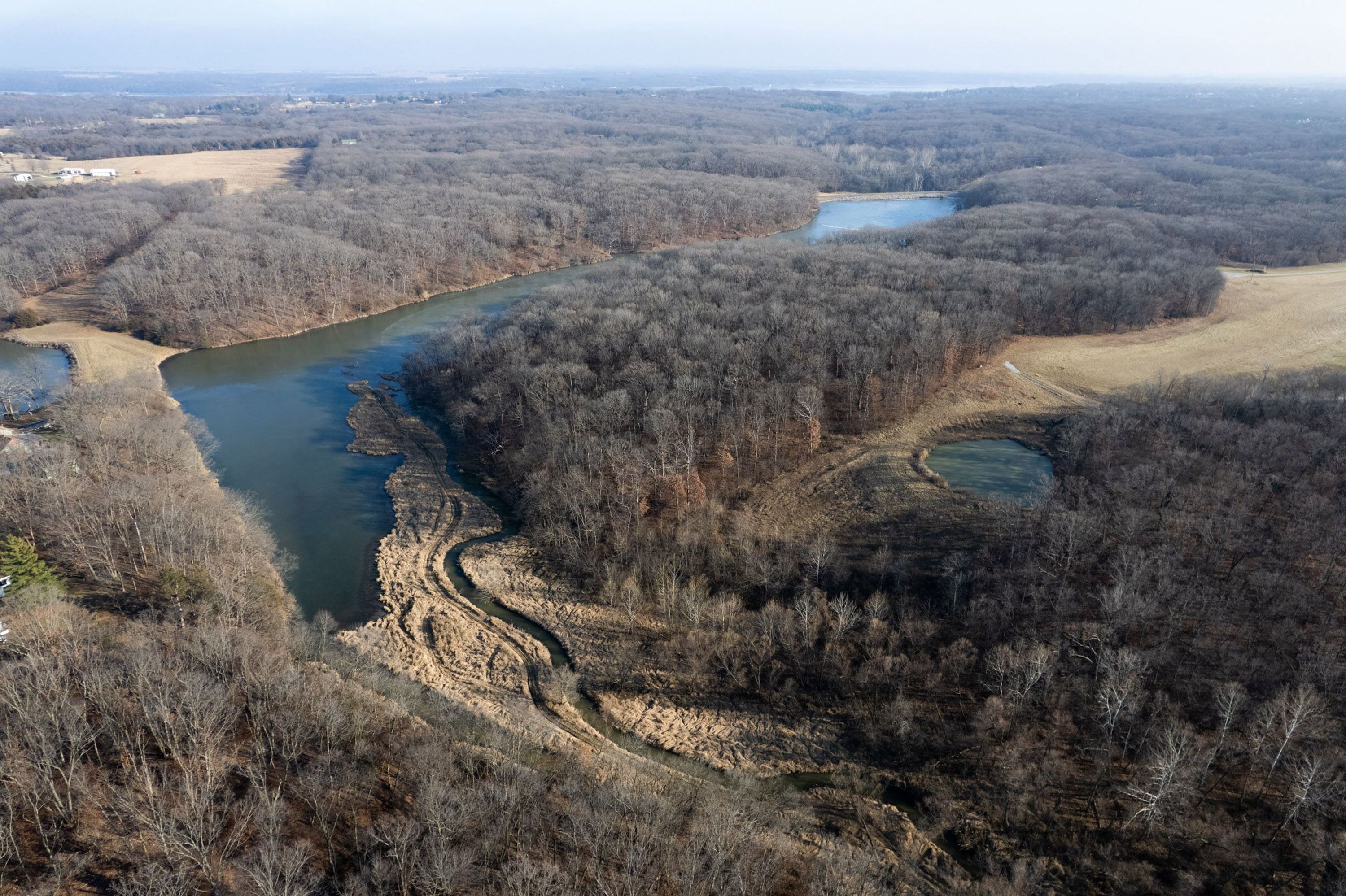 The property is 42.3 surveyed acres and has a private driveway from Wirtz Lane that leads to a ridgetop of Oak timber. Wrapping around the north and east faces of the land are McDowell Lake, a private body of water that is approximately 20 acres and was constructed in the late 1960s. It has a gated driveway, a small pond, and lake frontage. McDowell Lake is private and only accessible to the homeowner association members. This pristine lake is stocked with crappie, bass, and sunfish. Boats with electric trolling motors are permitted on the lake.