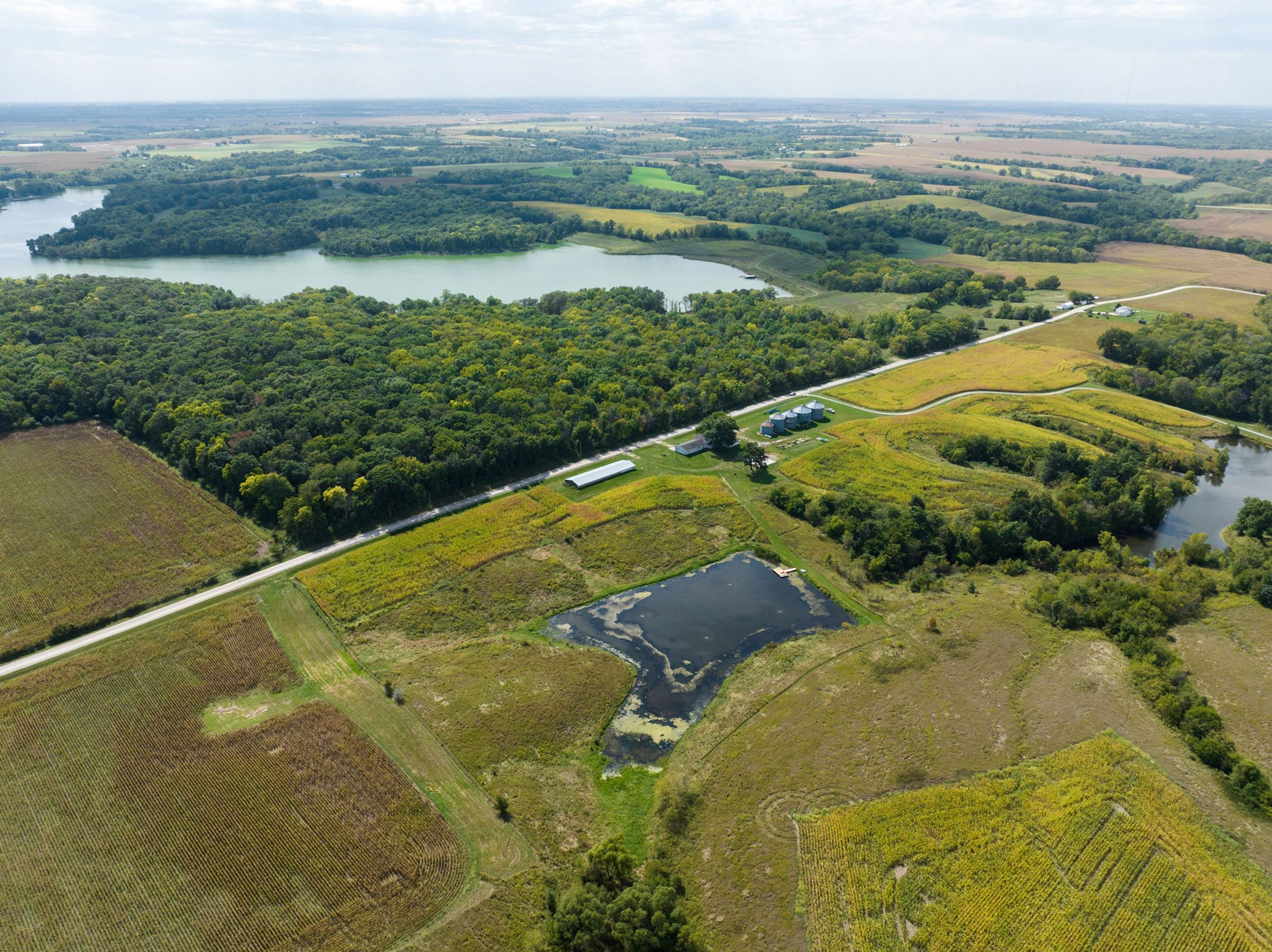 The as-is home has 1,408 square feet of living space with two bedrooms and one bathroom. It has some recent improvements and brand new septic. There are bass, bluegill, and catfish in the 2-acre pond, which has a nice mowed lane across the dam, a brand new doc, and an aeration system. Surrounding the pond are native grasses and sapling hardwoods from the four acres of Conservation Reserve Program, compensating the property owner for promoting soil and water conservation with wildlife habitat.