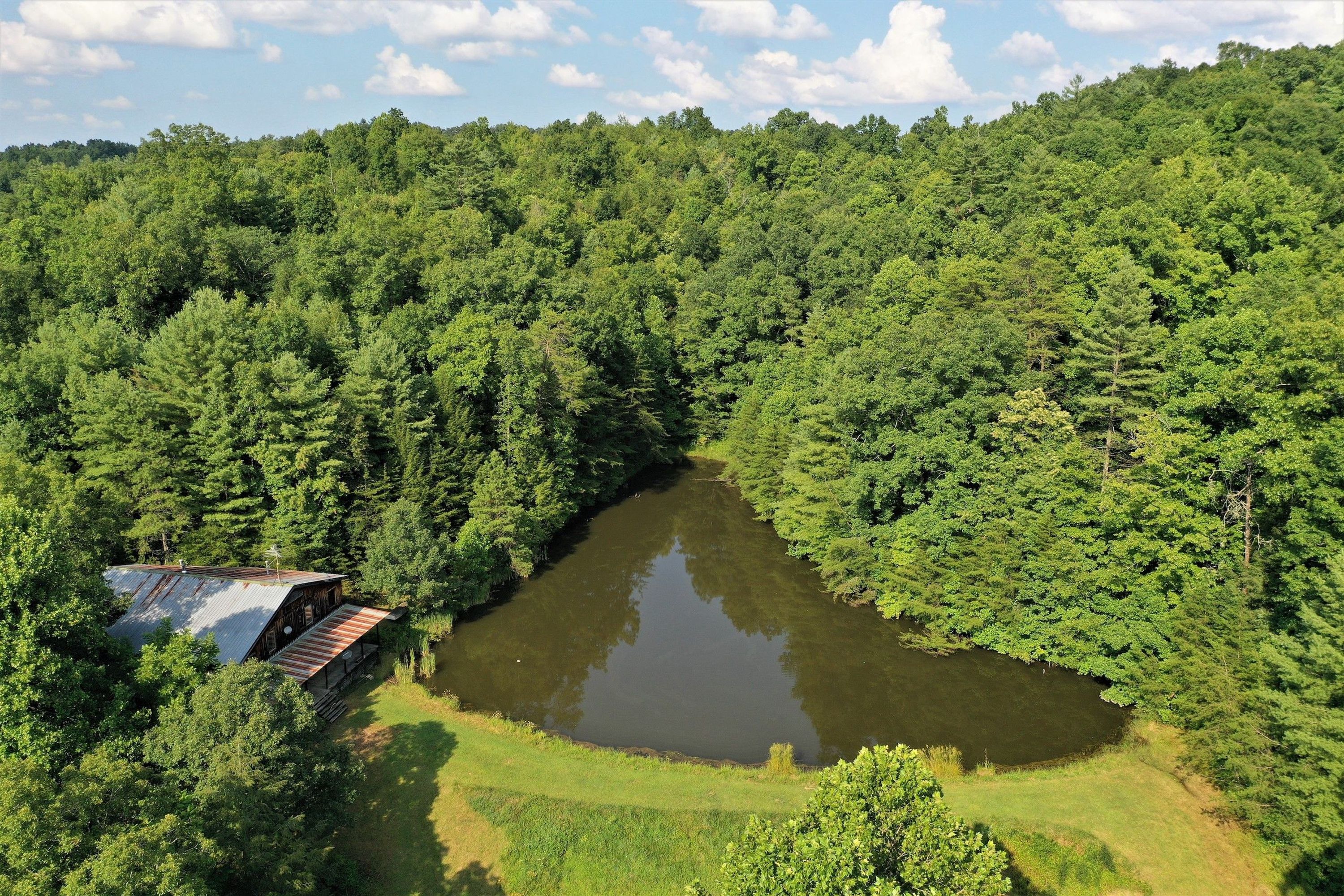 Situated alongside the 12,000 acres Clifty Wilderness Area of the Red River Gorge, at the end of a gravel road is this beautiful, spacious custom-built cabin nestled on a ½ acre pond. Here you feel a million miles from nowhere but are still only a short country drive away from the amenities of town we have all come to rely on. This vast landscape is mildly rolling with just the right blend of open pasture/tillable land along the creek bottoms and a wide variety of oak, hickory, and hemlock with rhododendron along the drains and mid-elevations. This gorgeous farm is full of wildlife with healthy populations of deer, turkey, bobcat, fox, etc.… providing the outdoor enthusiast abundant opportunities to hunt, hike, and explore this breathtaking terrain. Perhaps you would like to raise livestock or grow a garden or orchard in the open fields? The beautiful cabin is livable as it sits; however, it is approximately 75% complete on the inside. This allows the new owner to come in and finish it out with their own tastes and liking. The cabin is well positioned overlooking the picturesque, stocked pond and is solidly constructed with thick, rough sawn lumber. With the true 2x and beam construction throughout, you can feel the sturdy construction and solidness of this structure. You could literally sit on the porch and fish!! The gorgeous, vaulted ceiling and open room concept makes for an awesome yet cozy feel. If it’s rest and relaxation you are wanting, then escape into the outdoor mecca that awaits at your fingertips. Take a hike through the mildly rolling terrain walking right off your property into thousands of acres of Daniel Boone National Forest, exploring the upper reaches of the Gorge and breathtaking Red River adjoining this property along the south boundary. This beautiful property has everything you could want in a weekend getaway. If the tranquility and privacy of being at the end of the road without constant traffic noise sound like what you need more of. Then give me a call, and let’s see if this beautiful retreat is just what you’ve been looking for!