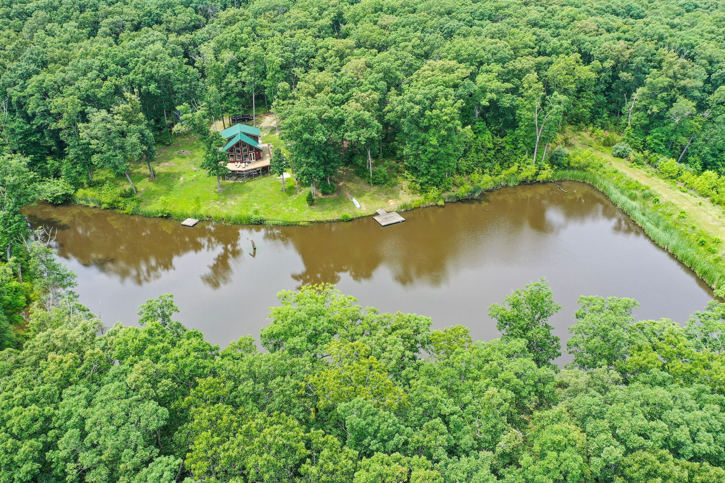 Have you ever wanted a cabin tucked way back in the woods with a nice lake to boot? Here’s your chance! This timber property is super cool and makes you feel as if you are in the middle of nowhere, even though it’s less than an hour from the STL Metro Area. The cabin features 2 guest bedrooms and a master bedroom upstairs. There is a nice bathroom on the main level and an unfinished bathroom in the master bedroom. The kitchen is super nice and has all stainless steel appliances, custom cabinetry, and granite countertops with a built-in stovetop. The living room offers great views over the lake and has a very “lodgy” feeling as you sit under the great chandelier that hangs overhead. The massive stone fireplace on the north wall makes for cozy evenings before going to bed, as well as additional seating. The wrap-around deck is perfect for spending time outside and is a great place to bbq, relax, and just enjoy the secluded setting. The basement is unfinished and is ready for the next owner to set it up the way they desire. The lake is approximately 2.5 acres and is stocked with bass, catfish, crappie, and bluegill. There is a red 30x30 metal outbuilding just up the hill from the cabin and is perfect for storing ATVs, hunting equipment, tractors, etc. The rest of the property consists of a healthy mix of big mature timber, along with some younger growth. There is also a potential food plot site on top of the ridge on the east side of the lake. This lightly hunted property has consistently produced nice bucks and big longbeards in the spring. Another bonus feature is Daniel Boone Conservation Area borders the west side of the property and adds an additional 3520 acres of hunting/recreational area so you will have plenty of room for all of your family and friends!! Too many features to list! To schedule a showing, call Aaron Bennett today!