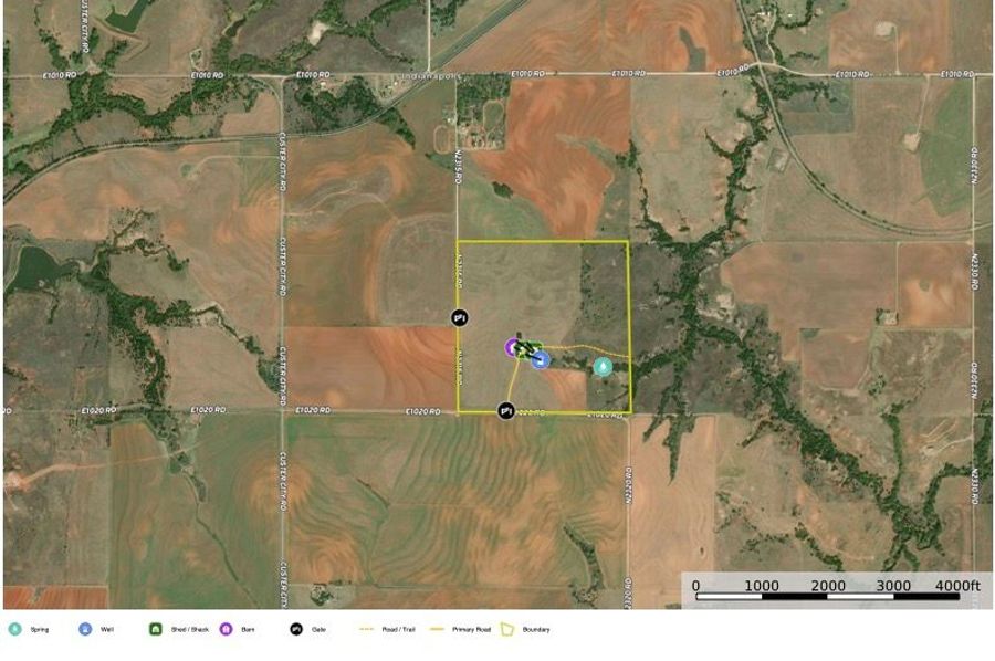 Here’s a fantastic home-site location between Weatherford and Clinton! It has a 4,000sq/ft. (80’x50”) metal-framed building with concrete floor. It has two additional outbuildings and a high-production water well. There’s a rare spring-fed creek bottom providing year-round water supporting beautiful hardwoods. Imagine having deer and turkeys in your yard in the evening! There are approximately 100 acres, separately fenced, in a 2-year-old Midland grass pasture. The balance is native grass and trees. The property is secluded but easily accessible. It lies less than 2 miles north of I-40, 6 miles east of Clinton, 7 miles west of Weatherford. It’s gated, sloping west to east, providing numerous options for home-site locations, and only 1 mile east of Custer City Road. The neighboring tracts hold a lot of wildlife. Deer use this property to transition from bedding to feeding, providing great hunting potential. This tract is very scenic. When you combine the shop, out-buildings, cross-fencing, spring, water well, electricity, hardwood trees, and great road frontage, it provides an executive home-site location.