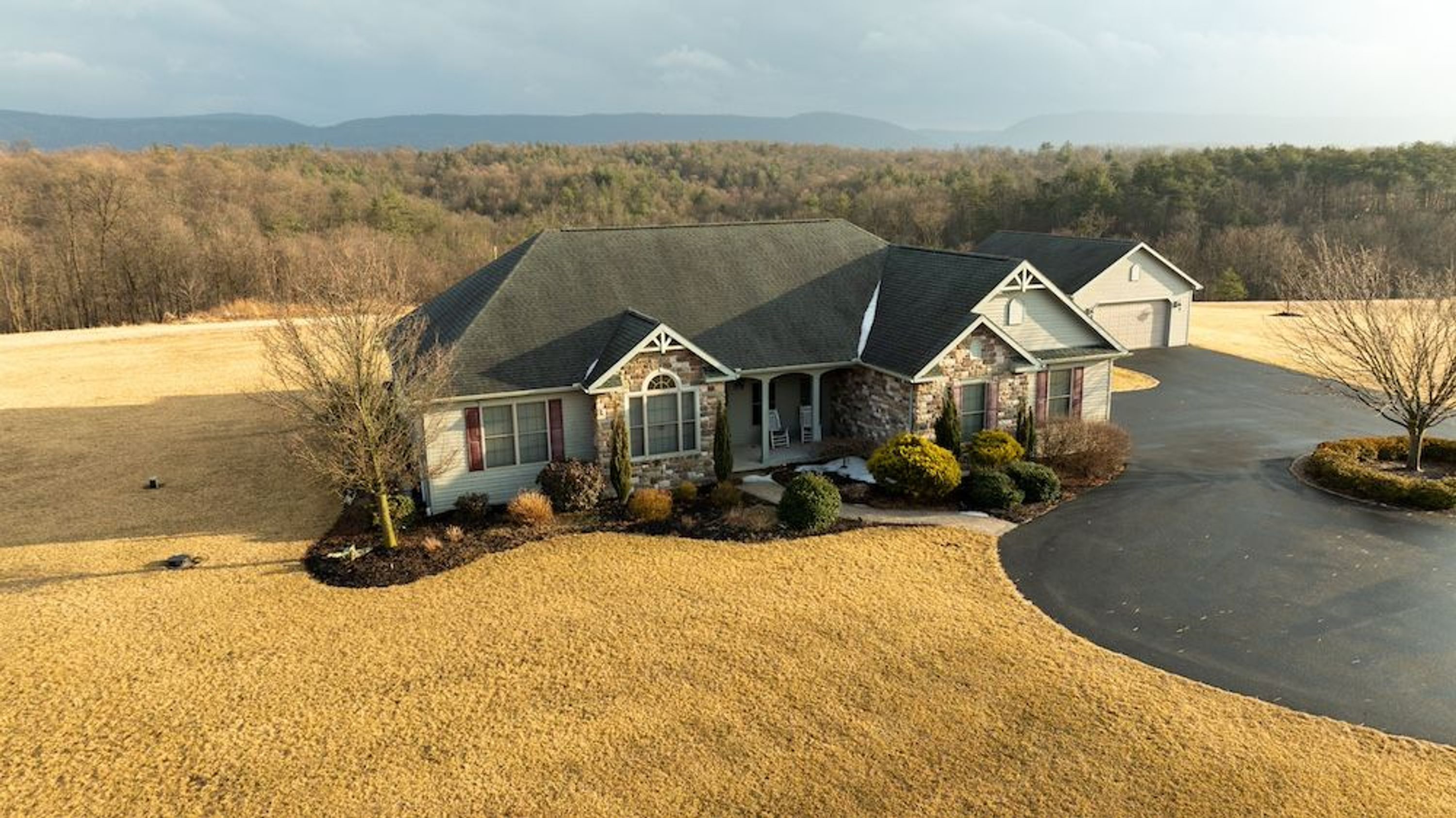 PRICE REDUCED! Welcome to this beautiful ranch-style home that combines comfort, style, and convenience in every detail, set on an expansive and picturesque property. As you step through the front door, you are greeted by a spacious living room featuring vaulted ceilings and a stunning stone gas fireplace, creating a warm and inviting atmosphere. The open-concept floor plan seamlessly flows from the living room into the dining and kitchen area, ideal for both everyday living and entertaining. The chef’s kitchen is equipped with high-end appliances, including a gas range, making it a perfect space for culinary creativity. Adjacent to the kitchen is the main suite, complete with vaulted ceilings, his and her closets, and an adjoining luxurious main bathroom. The main bath features dual sinks and a tiled shower with dual shower heads for a spa-like experience. The two guest bedrooms are generously sized and share a well-appointed bathroom with dual vanities, a separate toilet room, and a shower. A convenient half bath is located near the kitchen for guests, and the first-floor laundry room adds even more convenience to this thoughtfully designed home. Abundant closet space throughout the main level offers ample storage, making organization a breeze.