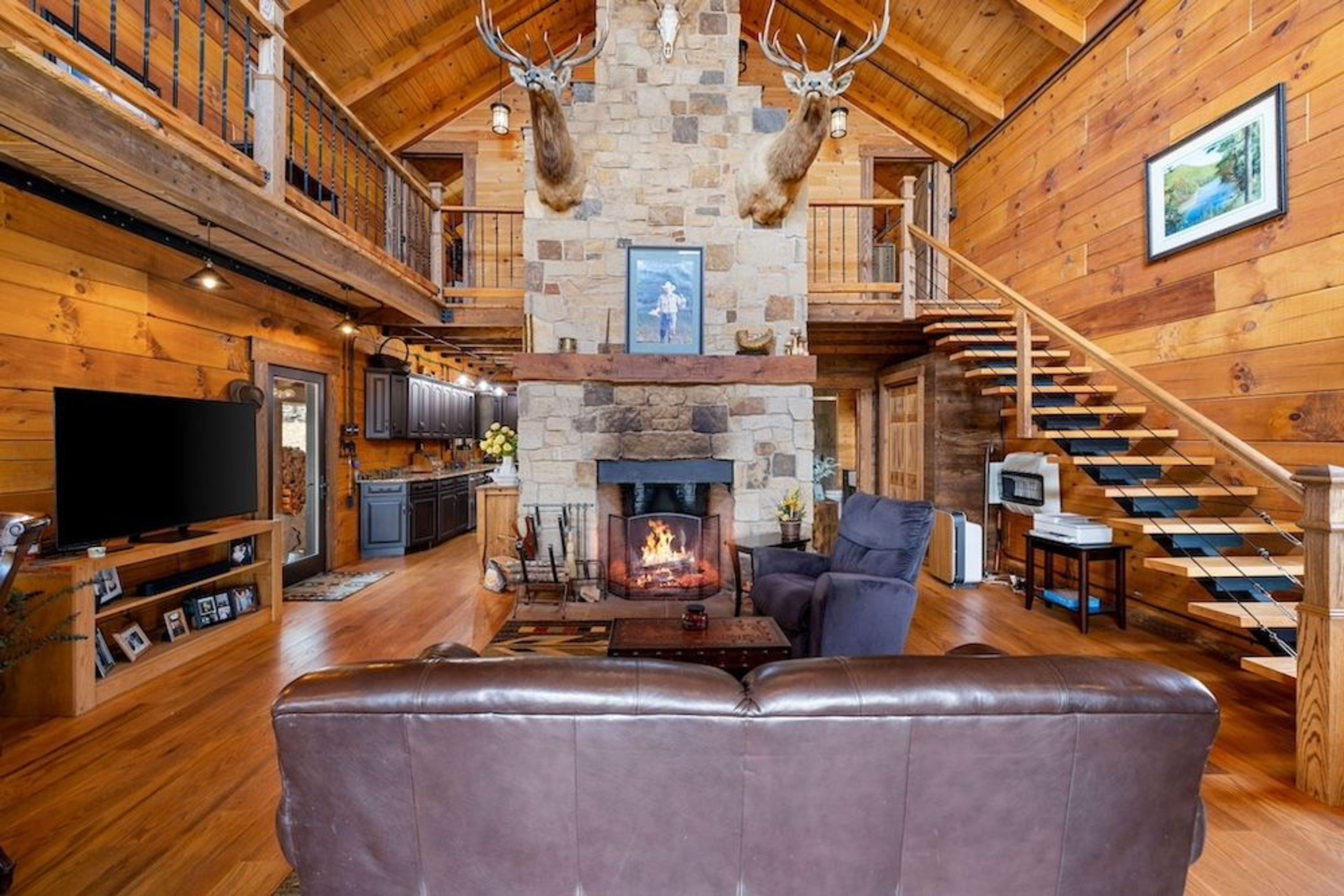Step inside to an inviting interior wrapped in tongue-and-groove pine, exuding warmth and rustic charm. The vaulted great room features a massive stone fireplace as its centerpiece, with a built-in pizza oven on the opposite side. The open-concept kitchen flows seamlessly from the living area and is outfitted with top-of-the-line stainless steel appliances, ample counter space and a breakfast bar.