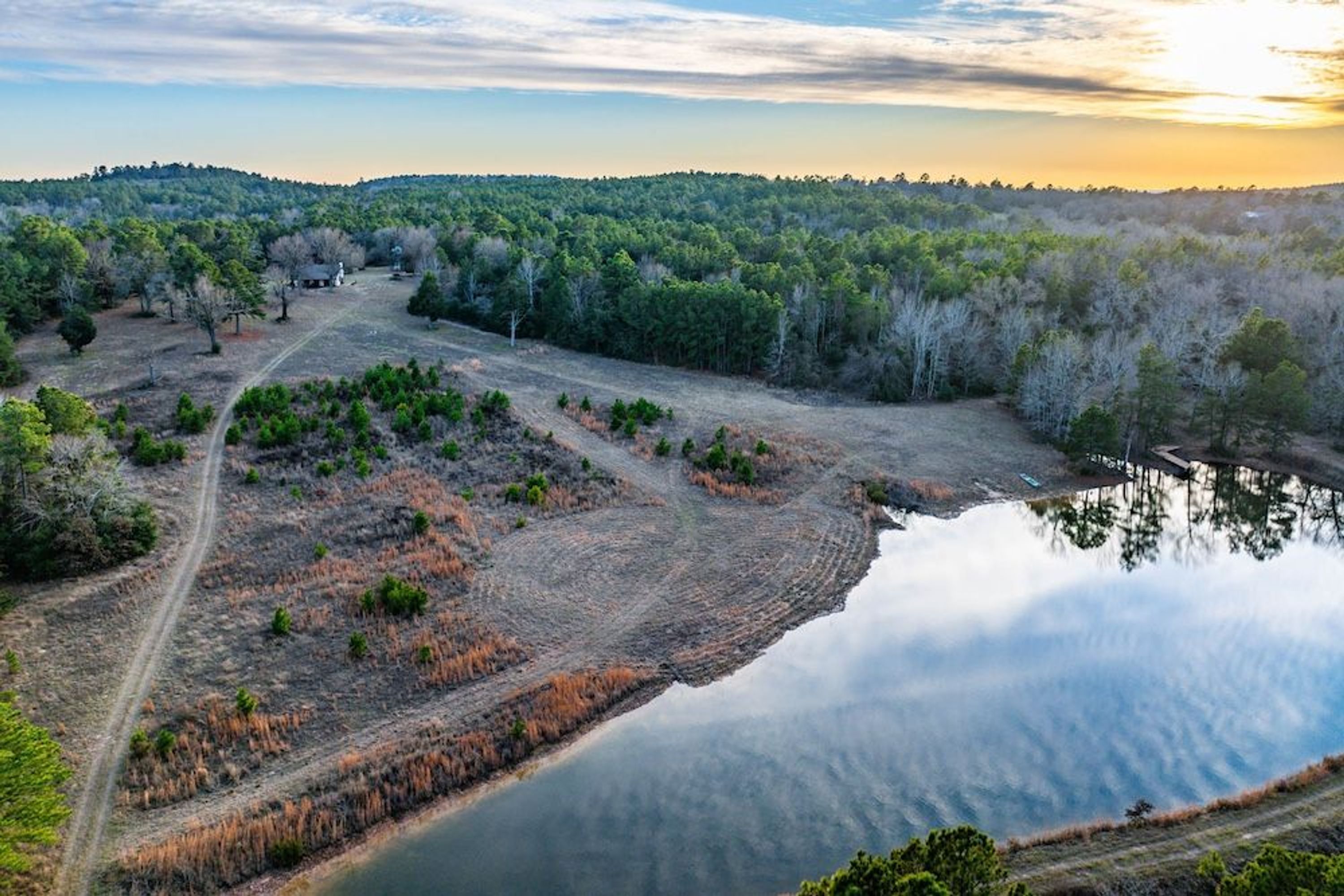 Land Characteristics: This remarkable property showcases a blend of native timber and rolling hills with approximately 200 feet of elevation change. The land is heavily wooded with a variety of East Texas trees, including multiple species of Oaks, a mix of native and planted Pines, and vibrant Dogwoods that bloom in spring. A picturesque 1.6-acre pond sits at the base of a scenic field filled with native grasses. The diverse vegetation attracts rich wildlife such as deer, wild hogs, and other game, making it a prime hunting location. Winding trails traverse the property, some featuring rustic benches that offer peaceful spots to relax and take in the surroundings. Whether your passion is exploring, hunting, fishing, or simply enjoying nature, Chimney Ridge Ranch offers it all.