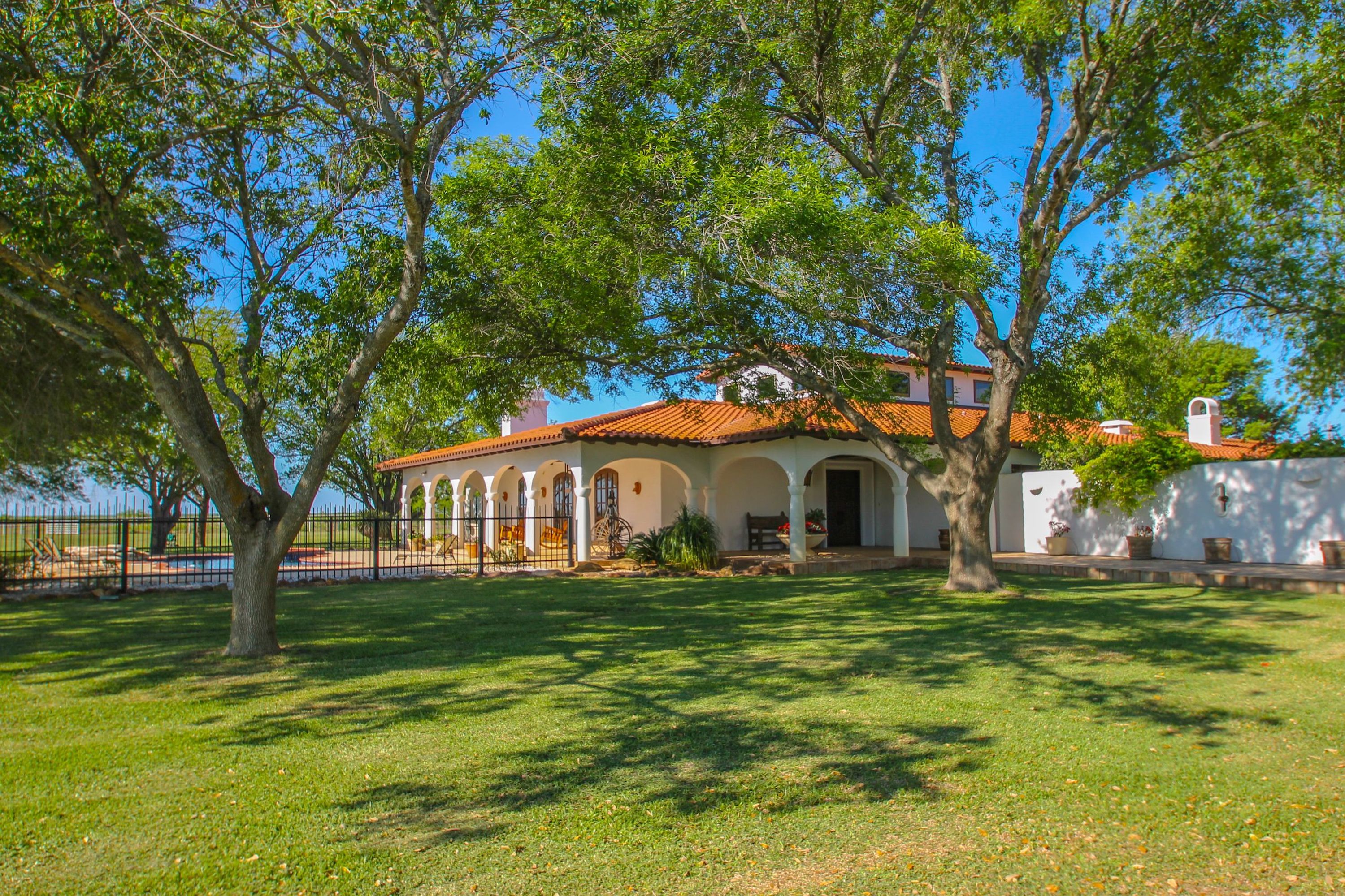 Ranch Lodge: As you enter the Double Dime South from the gated entrance off the county road, you are welcomed to the magnificent residence with Mediterranean and Spanish architectural influences overlooking the large stocked bass lake. The 5,000 foot paved runway is adjacent to the home, providing convenient access to the ranch for those preferring air travel, with ability to taxi to the house and park in the hangar. There is one mile of paved internal road to the residence, which features approximately 10,000 sqft under roof, with 6,458 sqft of living space, large patio areas, and an attached garage. The living room contains prominent high ceilings and an enormous stone fireplace that acts as the central focal point for the entire house. Spanish tile floors and elevated ceilings are throughout the home, with each bedroom accessed off the living room and each having small exterior private courtyards. The home features 4 bedrooms and 5 and half bathrooms, separate breakfast and dining areas, game room, office, and wonderful patio and pool area.