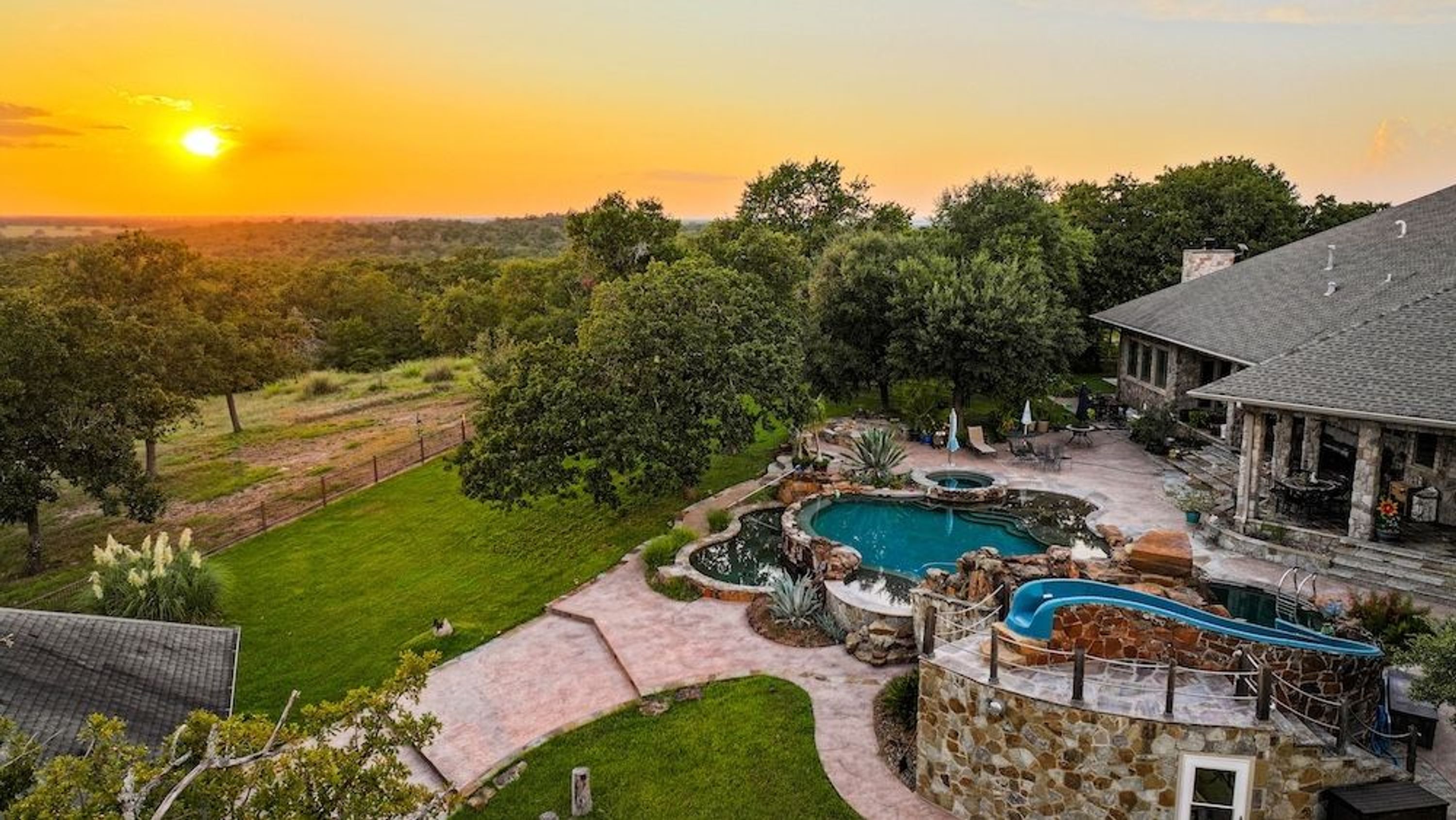 Improvements: In addition to its expansive acreage and natural beauty, the property boasts a custom-built 4,695+/- sq ft main residence, thoughtfully designed with quality craftsmanship and spacious living areas. Some of the finer finishes include Brazilian slate and custom cabinetry. A separate 1,200+- sq ft guest house offers comfortable accommodations for extended family or guests. At the heart of the outdoor space is a stunning custom infinity-edge pool, complete with a built-in waterslide, creating a true backyard oasis perfect for warm Texas days and gatherings with friends and family. The property is well-equipped for both recreational and functional use, featuring two large barns that provide ample storage for equipment, vehicles, tools, and hobbies. A dedicated greenhouse allows for year-round gardening, adding to the property’s versatility and self-sufficiency. Located at the end of a quiet cul-de-sac, this ranch offers blacktop road access and an automatic gated entrance, ensuring both security and privacy.