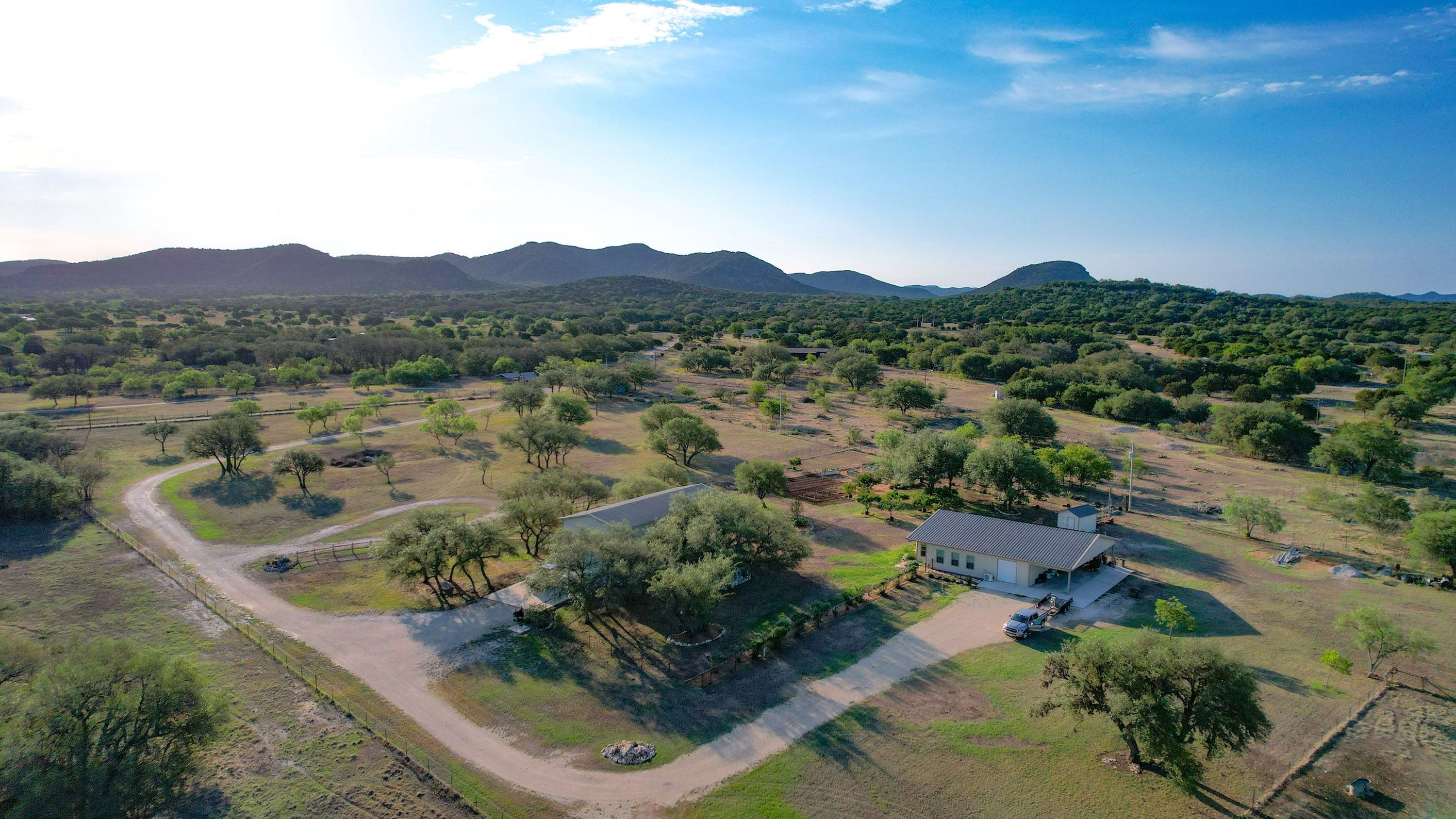 Improvements: A custom barndominium-style, tastefully-finished main home offers a large open living & kitchen area, a main suite and guest bedroom, loft, large pantry/office area, and two full baths as well as a huge garage/shop portion which could easily be absorbed as additional living space if desired. A covered front patio allows for great views of the sunrises over the nearby hills, and a back patio complete with a hot tub is the perfect place to enjoy a hill country evening. The second barndominium functions as a guest/bunkhouse with a full kitchen, large bathroom w/walk-in shower, a huge great room, and tons of foam-insulated shop space as well as a greenhouse accessible from the shop and covered parking for vehicles and/or equipment. Thirty-eight large solar panels on the guest house provide electricity to run the houses and a contract is in place to sell the unused power back to the power company, straight through the panels and back into the grid.